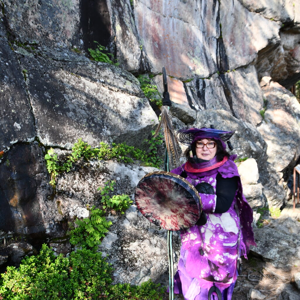Amatsoni-hahmo, Innis-äitiamatsoni, luotsaamassa Kenkäveron jäsenristeilyä Astuvansalmen kalliomaalauksille, Ristiinaan.